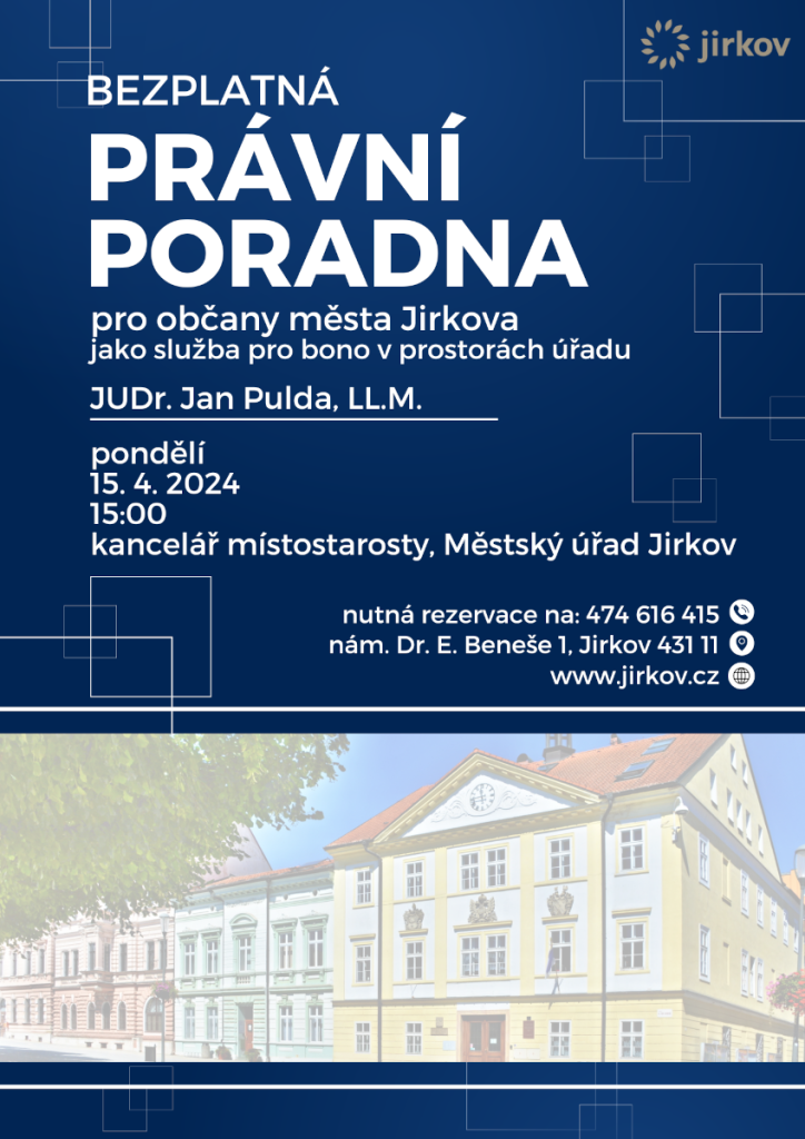 V pondělí 15. dubna od 15 hodin v kanceláři místostarosty městského úřadu bude opět zdarma poskytovat právní konzultace pro jirkovské občany služby pro bono advokátní kancelář JUDr. Jana Puldy, LL.M.