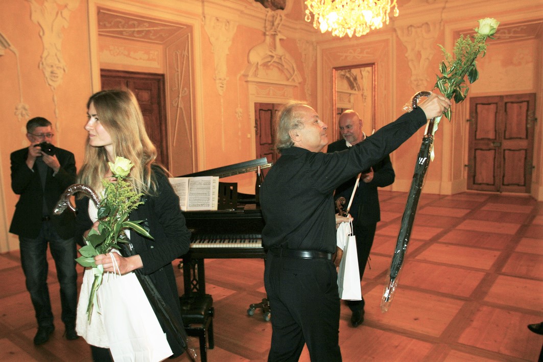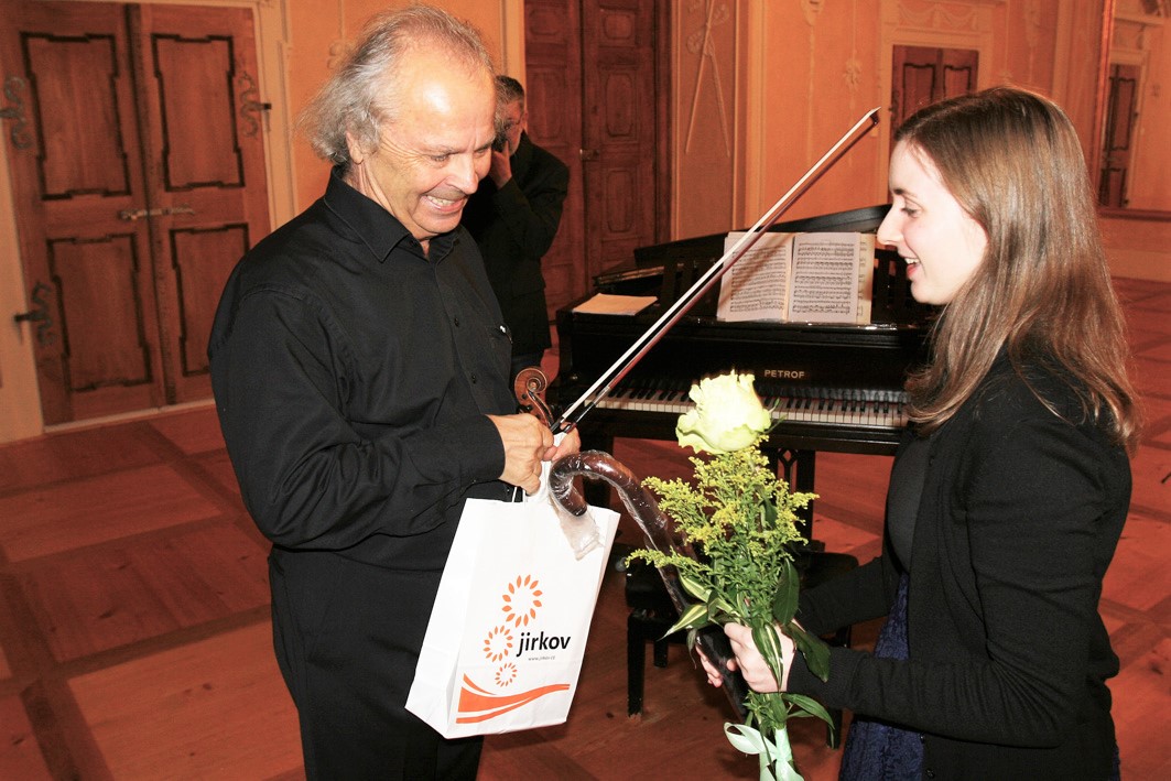 Václav Hudeček se v sále dočkal gratulace k životnímu jubileu. Oba hudebníci sklidili v závěru dlouhotrvající potlesk, při němž diváci vstávali ze židlí.