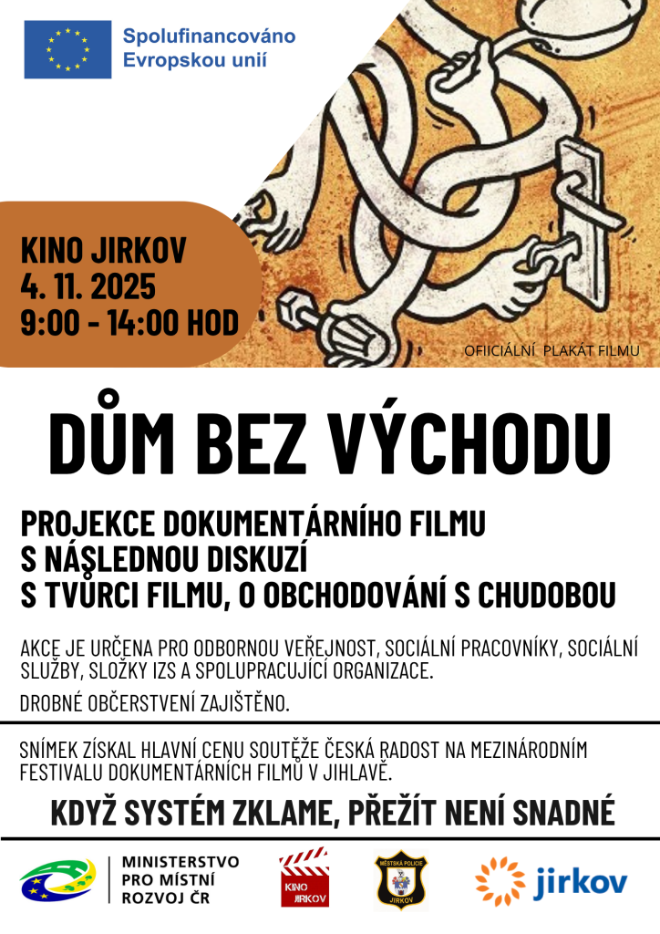 V Kině Jirkov se včera uskutečnila „předpremiéra“ českého dokumentárního filmu Dům bez východu režiséra Tomáše Hlaváčka z roku 2024. Snímek, který získal hlavní cenu soutěže Česká radost na Mezinárodním festivalu dokumentárních filmů v Jihlavě, se věnuje závažnému tématu obchodování s chudobou.