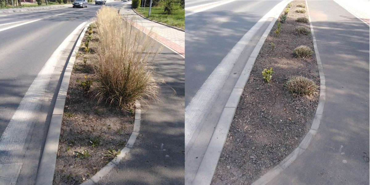 První sluneční paprsky probouzejí k životu všechny rostliny včetně nechtěných plevelů. Proto společnost Onza v těchto dnech věnuje pozornost mimo jiné pletí a okopávání okrasných záhonů. Fotografie ukazují stav před a po vyčištění záhonů v Palackého ulici.