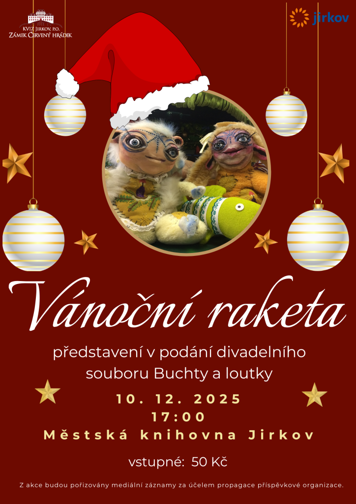 Přijďte se společně s dětmi naladit na tu pravou vánoční atmosféru! Čeká vás originální, hravé a vtipné loutkové představení plné fantazie, které potěší malé i velké diváky. „Vánoční raketa“ vás vezme na neobvyklou cestu za Vánoci – s trochou legrace, dobrodružství a samozřejmě s kouzlem Vánoc.